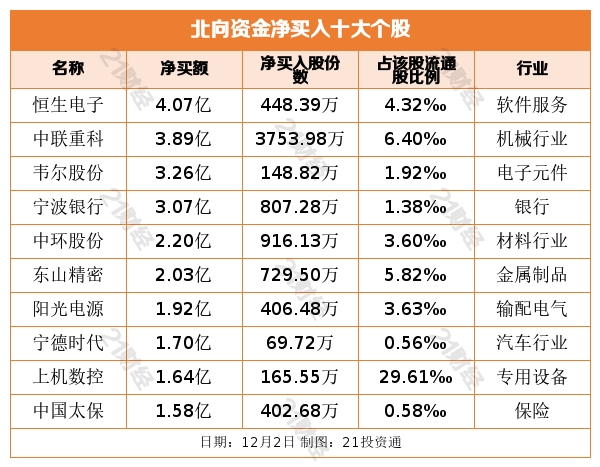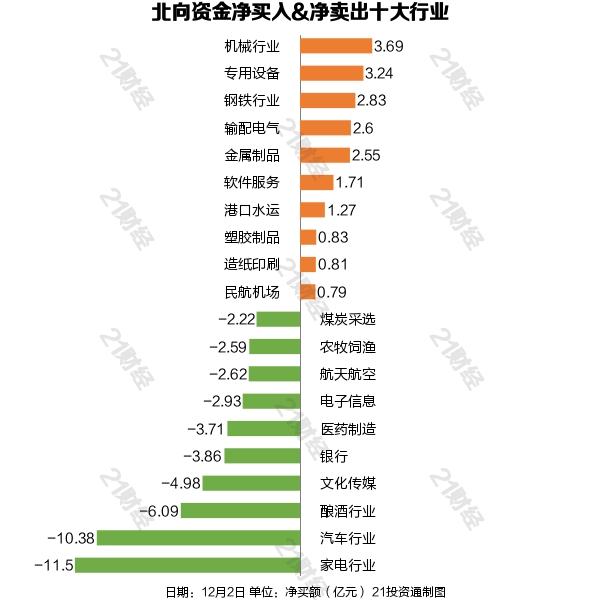 据21投资通智能监测,12月2日,北向资金净卖出40.25亿元,其中沪股通净卖出8.48亿元,深股通净卖出31.77亿元。北向资金此前已连续4日保持净买入,合计净买入金额达297.37亿元。