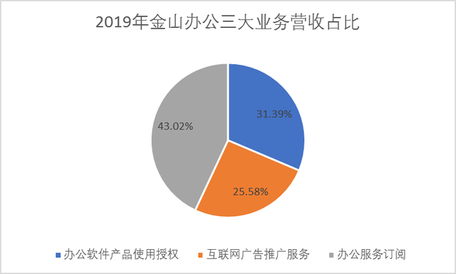 根据金山办公2019年报数据显示,其主要营收来源于三大板块业务,分别是办公软件产品使用授权、办公服务订阅和互联网广告推广三种。而这三大业务在其总营收占比中分别为31.39%、43.02%和25.58%。付费服务已经成为了其主要营收来源,广告业务反而只占据了极小的一部分。