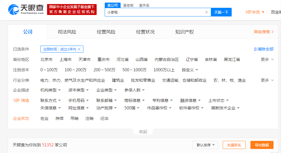 据天眼查APP数据显示,选择注册成立一年以内的小家电企业有高达51352家公司。此前也有媒体报道称,天眼查统计数据显示,今年二、三季度,国内小家电行业企业注册量出现井喷,每月新增企业注册数量均超过1.5万家。其中,4月注册量达2万家,第二季度单季度新增超过5.8万家。