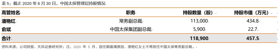 管理层股权激励领先同业。截止2020年6月30日,太保管理层中潘艳红、俞斌(太保集团副总裁)分别持有公司113000股、5900股,合计持有11.9万股。我们认为,高管持股绑定管理层与股东利益,尤其是寿险总经理潘艳红持有公司最多股份,管理层激励机制有望为公司带来更为突出的执行力。