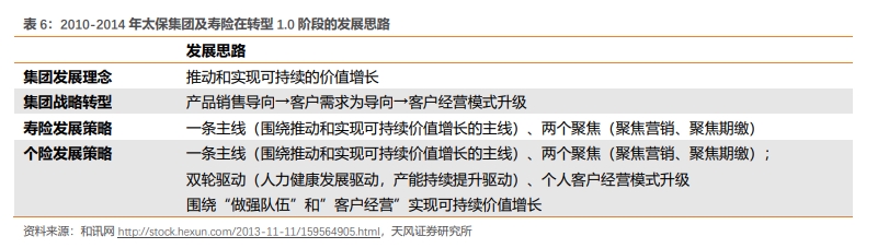 转型1.0:聚焦营销、聚焦期缴,以客户需求为导向。2010年太保寿险的银保渠道保费占比超过50%,若收缩银保业务、调整业务结构,或将直接造成保费收入的大幅下滑,对内难以达成业务规模增长的经营目标,对外又将面临市场地位不保的被动局面。内忧外患之中,太保寿险对市场环境进行了全面研判,开启了价值转型之路,把握行业发展趋势、市场竞争及客户需求变化,太保寿险提出从“以产品销售为导向”到“以客户需求为导向”的转型战略,1.0转型围绕一条主线、两个聚焦、双轮驱动。“一条主线”是指围绕推动和实现可持续价值增长的主线;“两个聚焦”即聚焦营销(个险)、聚焦期缴;“双轮驱动”指人力健康发展驱动,产能持续提升驱动。自此,太保寿险大力发展高价值的个险期交业务,逐步缩减银保业务,乃至于撤销银保渠道。