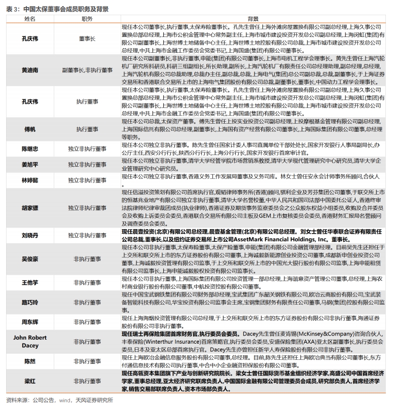 董事会成员构成进一步丰富,预计治理结构更趋国际化、市场化。今年太保引入陈然先生、John Robert Dacey先生、梁红女士为公司董事会非执行董事,引入刘晓丹女士为独立非执行董事。其中:1)陈然先生为上海欧冶金融信息服务股份有限公司董事、总经理;东方付通信息技术有限公司执行董事、中合中小企业融资担保股份有限公司董事;2)John Robert Dacey先生为瑞士再保险集团首席财务官、执行委员会委员;3)梁红女士为高瓴旗下产业与创新研究院院长。此前太保董事会的非执行董事多数来自上海国资体系;4)刘晓丹女士现任晨壹投资(北京)有限公司总经理,曾任华泰联合证券有限责任公司总裁、董事长。我们判断,太保董事会成员趋于多元化与专业化的背景,将利于公司完善治理机制,提升经营能力,为后续公司业务发展提供战略和资源上的帮助。