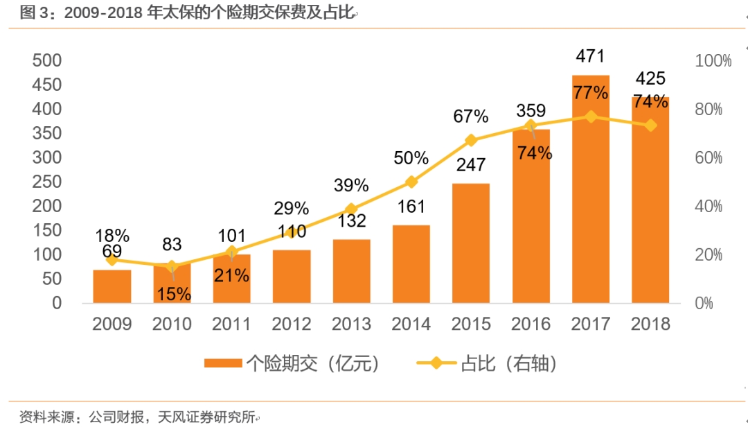 2、期限及产品结构:个险期交业务高速增长;长期保障型占比提升。期限结构方面,转型期太保的个险期交业务高速增长(2010-2018年复合增长率达22.5%),个险期间保费占比从2011年21%提升至2018年74%,驱动寿险新业务价值与价值率持续增长。产品结构方面,太保坚持以长期健康险发展为主,代理人渠道的长期保障型产品增速快于长期储蓄型产品增速,长期保障型产品的新单保费占比大幅提升,由2011年10%升至2018年49%。