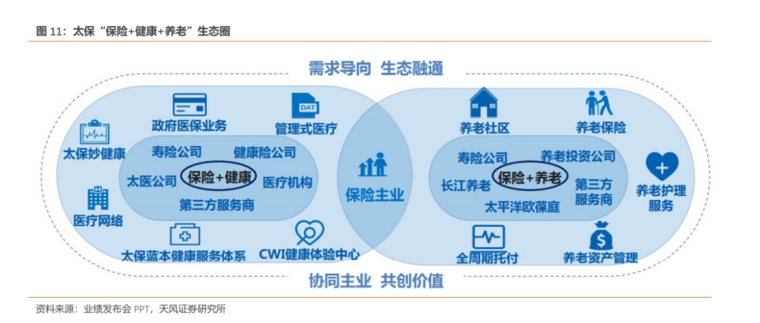 服务增值:以客户生态圈建设促进服务增值,丰富服务供给,凸显“太保服务”品牌,打造“保险+健康+养老”生态圈,协同保险主业发展。太保以保险产品为载体,进一步扩展和丰富保险产品的内涵和外延,深耕健康养老领域,促进产品、服务和技术的有机融合,为客户提供覆盖全生命周期的“保险+健康”、“保险+养老”综合服务,通过附加高品质服务,为客户创造价值的同时,也成为寿险业务增长的新引擎。