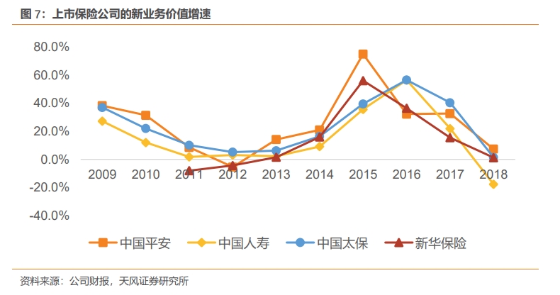 4、新业务价值增速领先同业,新业务价值率持续提升。转型1.0以来,太保寿险业务结构和业务质量不断优化,个险渠道保费收入持续增长、个险期缴占比提升、长期保障型业务发展迅速,驱动新业务价值同比增速领先同业,2010-2018年公司新业务价值复合增长率高达21.2%,高于国寿(12.1%)、平安(20.5%)、新华(12.6%);新业务价值率从2011年14.3%上升至2018年43.7%,领先上市同业。