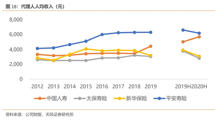 转型的目的在于建立从“增员驱动”向“产能驱动”的发展模式,从而优化代理人结构(即优增、清除产能代理人),提升代理人专业度、提升代理人收入从而提高留存率,但这些举措需要进行长期的改善才能产生效果,而在短期,太保代理人队伍发展仍承受了一定的压力,来源于人口红利消减、产品竞争加剧等行业性因素。因此,目前太保销售队伍的人均产能和收入仍处于较低水平。此外,绩优人力规模2019年来亦有所下滑。且代理人渠道今年受疫情影响超预期,明年有望恢复。