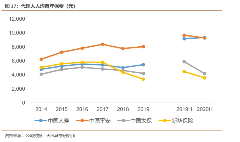4、根基扎实的代理人队伍。在转型2.0中最重要是销售队伍,关键在于形成“产能驱动”模式。1.0时期,太保采用“健康人海”战术,关注代理人基础管理,建立起一支基础扎实的代理人队伍。经过2018-2020年的调整,太保代理人规模有所下滑,但代理人人均首年保费基本保持稳定,2020年因疫情原因,队伍产能下滑严重。