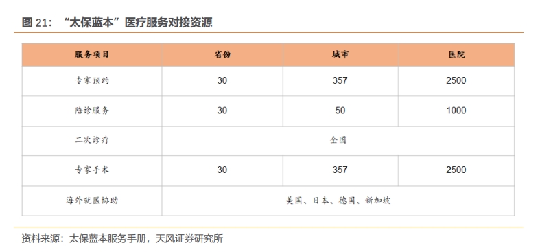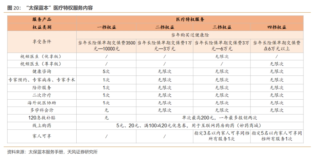“太保蓝本”是“保险+健康”服务生态圈的重要载体,自2019年推出以来,已累计覆盖约1000万人。“太保蓝本”打造的多层次的医疗服务体系包括:1、无门槛即可享受的重疾绿通服务,作为代理人获客工具;2、特定医疗险享受的服务,提升客户从短险向长险的转化;3、长险客户可享受的医疗特权服务,有助于推动长险件均的提升及客户加保。其中,太保蓝本医疗特权服务提供升级版的医疗服务,为不同保费级别的客户提供覆盖诊前、诊中、诊后的医疗协助服务。