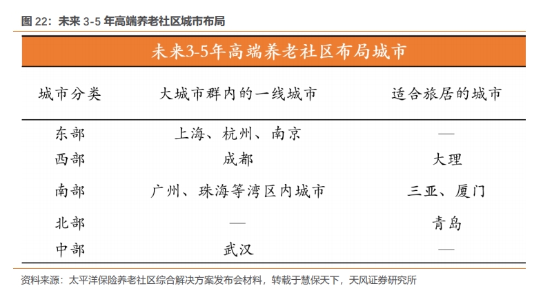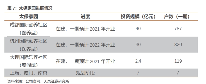 中国太保养老社区依据“聚焦集团保险主业高地城市、聚焦长三角等经济区域中心城市群、聚焦人口老龄化重度城市”的原则进行布局,按照“南北呼应、东西并进、全国连锁”的思路,加快推进6个城郊型和度假型高端养老社区项目落地。计划投资100亿完成养老产业初始阶段的布局,其中70亿建设城郊大型CCRC养老社区,30亿建设城市中小型康养项目。