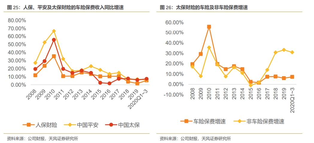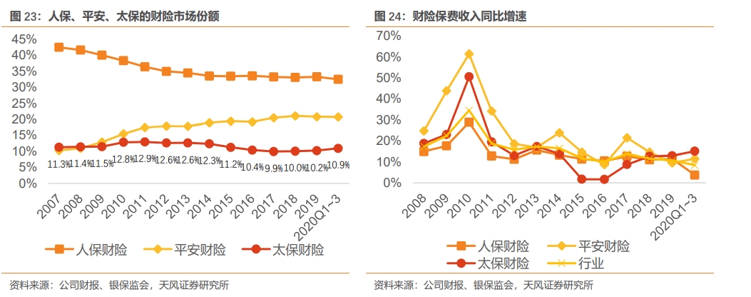 2014-2016年战略收缩规模提升质量,2017年来太保财险保费增速显著回升。2008-2013年为太保财险的高速发展期,保费CAGR高达24%,但在业务高速扩张下承保质量下滑、赔付率显著上升,导致2014年承保亏损。因此2014-2016年太保财险主动收缩业务规模,以提升业务质量,保费增速低于上市同业。2017年以来,太保财险渡过转型阵痛期,业务质量逐步改善,保费增速开始回升,2019、2020前3季度太保财险的保费收入同比增速高于其他两家大型公司及行业平均增速,太保的市占率从2017年的9.9%提升至2020前3季度的10.9%。