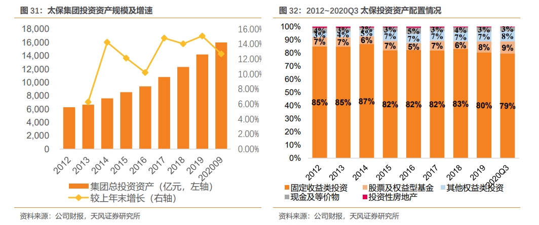 固收类资产占比高,投资风格稳健。截至2020年9月,集团总投资资产达15996亿元,较上年末增长12.7%。从资产配置来看,近几年固定收益类资产占比略有下降,但始终保持在80%左右,高于其他公司;股票及权益型基金配置较少,常年居于上市同业最低位,投资风格稳健。