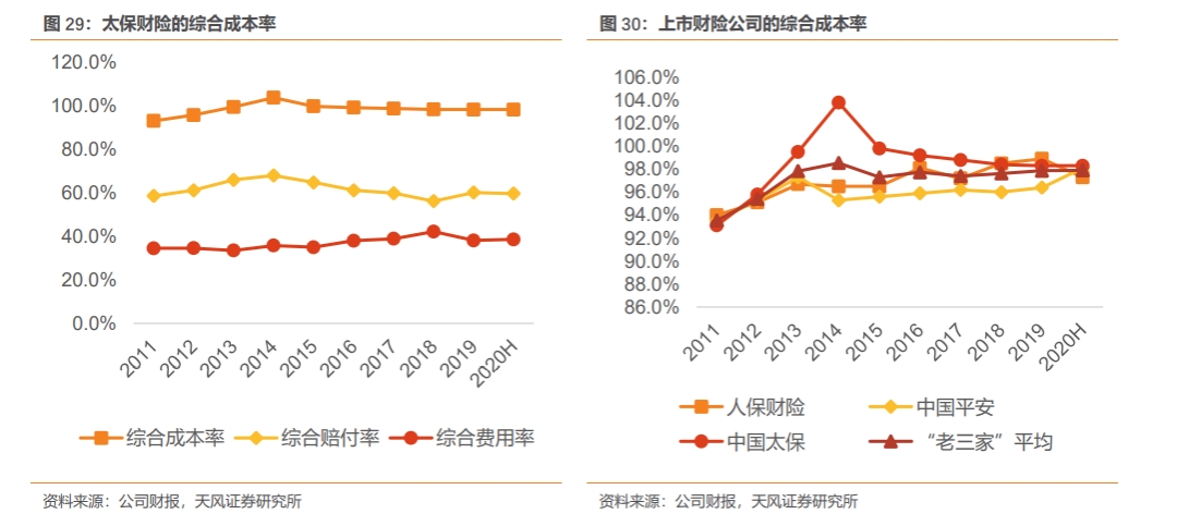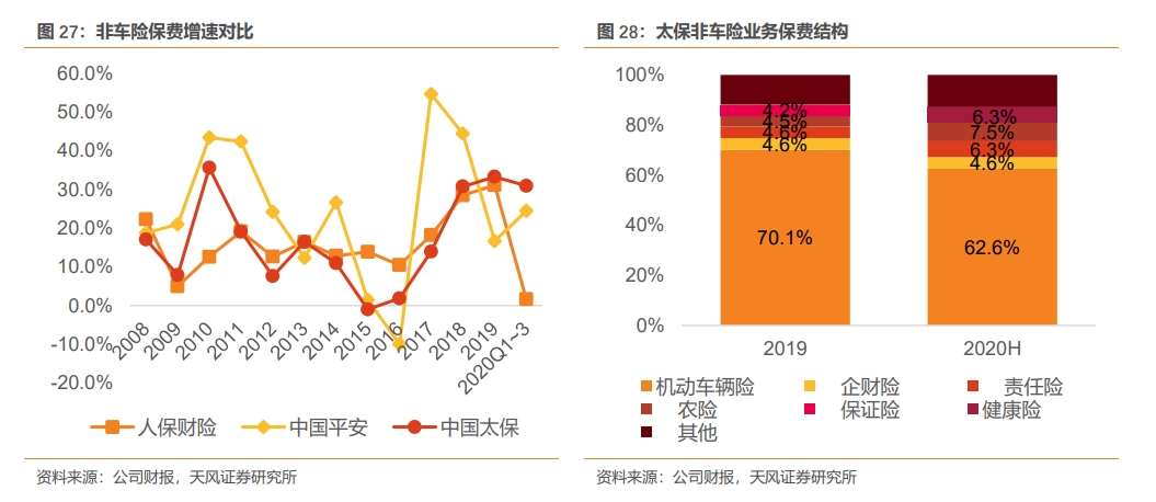 非车险种发展均衡、延续全面高增,农险、保证险等新兴业务增速较快。公司非车险种发展迅速,自2018年以来非车险增速持续维持在+30%以上,即使受疫情影响,公司2020年非车险仍保持高增长,2020年前3季度非车险保费同比增长30.9%。2020年上半年,非车险占比37.4%,其中农险、责任险、健康险、企财险占比分别为7.5%、6.3%、6.3%、4.6%,业务发展均衡。农险近年增长迅速,2020年上半年增速高达+50.7%,主要源于太保产险和安信农险并行经营、优势互补,安信农险是专业农险公司,此前经营区域较小、产品研发能力不足,而太保产险本身具有机构网络、品牌优势,双方优势联动,开发创新农险产品,驱动公司农险市场份额持续提升。2020年上半年责任险增速高达+34.1%。