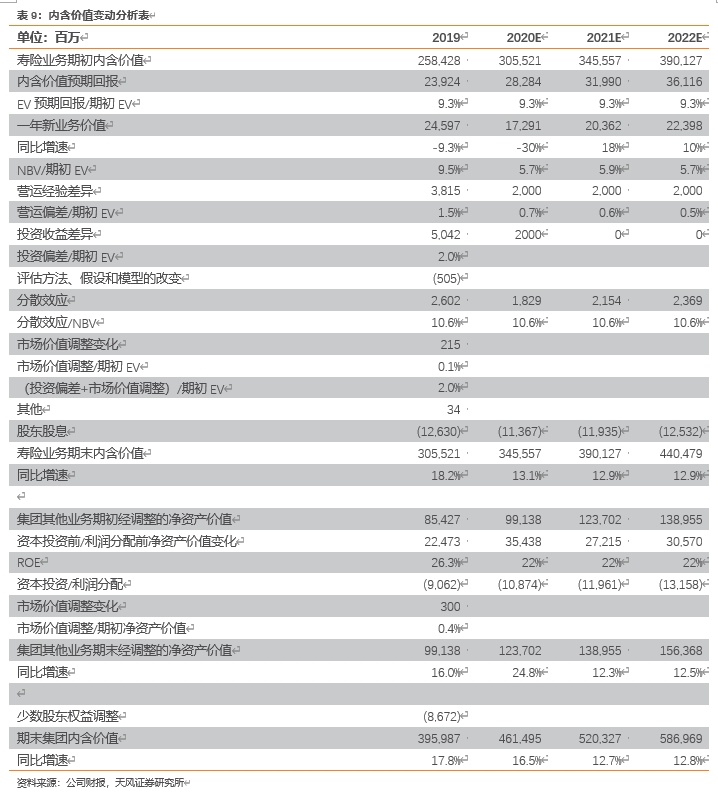 我们预计2020、2021、2022年太保寿险NBV增速分别为-30%、18%、10%,预计太保集团2019、2020、2021年内含价值分别为4615、5203、5870亿,同比增速分别为16.5%、12.7%、12.8%。
