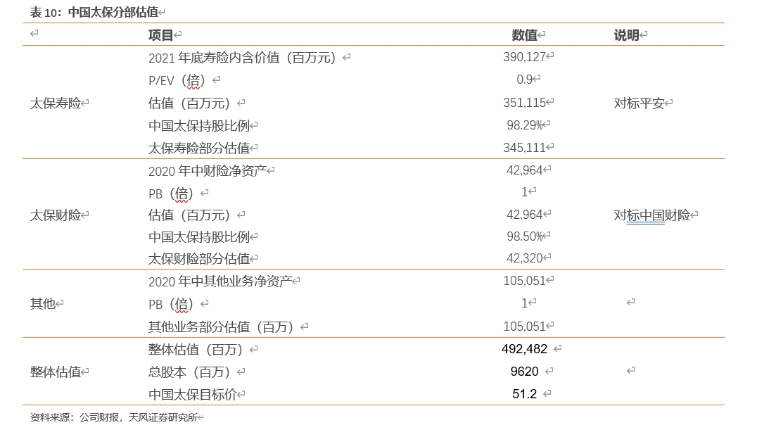 我们应用分部估值法对太保进行估值,对太保寿险使用 P/EV 估值,对太保财险业务按照PB给予估值:1)寿险:考虑太保寿险负债端向上的短期和长期因素兼备,我们给予0.9倍 2021P/EV;2)财险:对标人保财险,我们给予1倍PB;3)其他:以净资产估值,给予其他业务1倍 PB。分部估值法下太保集团的目标价格为51.2元,较目前股价有33.0%增长空间,给予“买入”评级。