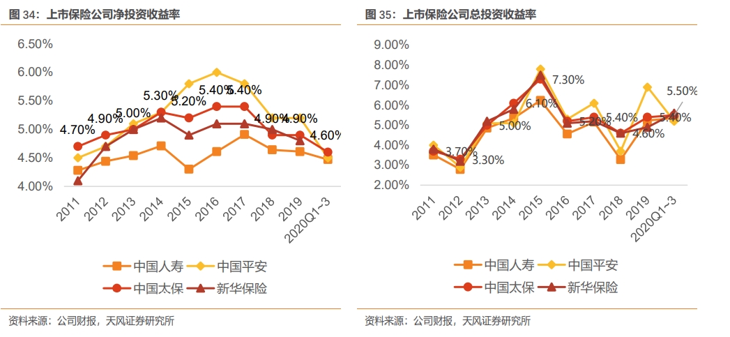 公司的投资收益率总体优于行业平均,且波动幅度低、稳定性更强。2011-2020年前3季度,太保净投资收益率均值为5.0%,仅次于平安(5.1%),优于新华(4.9%)、国寿(4.6%);太保总投资收益率为5.1%,仅次于平安(5.2%),优于新华(5.0%)、国寿(4.6%)。2012-2020年前3季度,太保综合投资收益率均值为5.97%,略低于平安(6.04%),优于新华(5.5%)、国寿(5.2%)。此外,波动幅度角度,太保投资收益率稳定性显著优于同业。