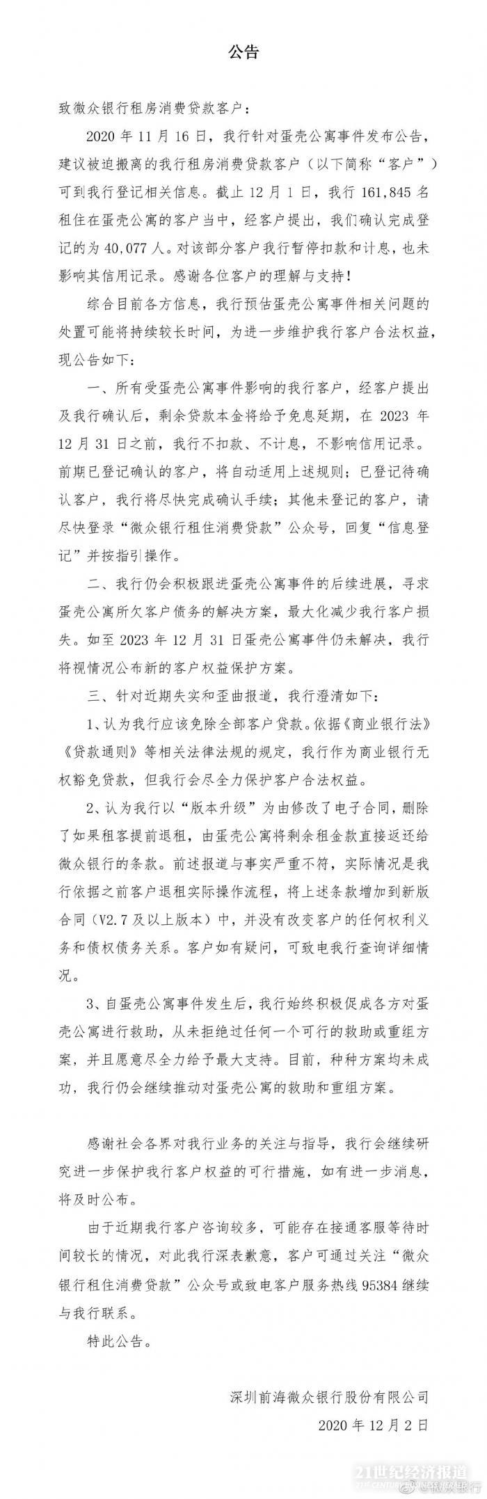 微众银行公告:蛋壳租金贷客户16余万人已有4万完成登记 登记完成客户已暂停还款计息