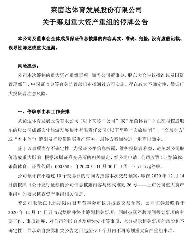 11月29日晚间,莱茵体育发布关于筹划重大资产重组的停牌公告,公告称,11月27日收到交易对方、控股股东的母公司文旅集团发来的重大资产重组的意向函,莱茵体育筹划发行股份购买文旅集团持有的成都文旅63.34%股权。