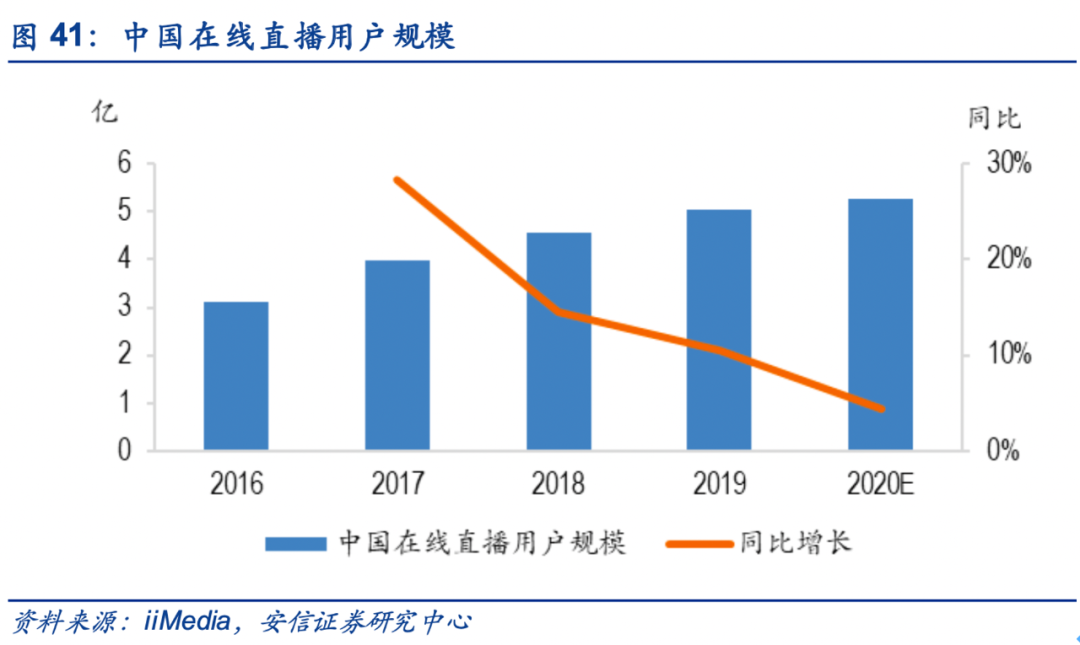 另一方面,以秀场、游戏为主的直播行业已经过了用户增长的红利期。iiMedia、安信证券的数据资料显示,国内直播用户的增速正持续放缓,预计2020年中国直播用户为5.3亿人,同比增速放缓至中低个位数。
