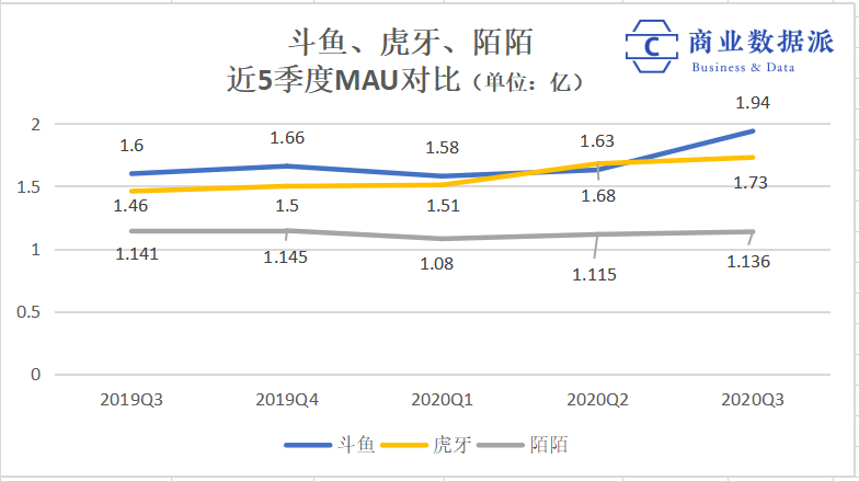 根据各家的Q3季报显示,斗鱼的MAU为1.94亿,同比增长18.60%,虎牙MAU为1.729亿,同比增长18.30%。陌陌的月活则为1.136亿,明显低于斗鱼和虎牙,且同比波动不大但也呈下降趋势。