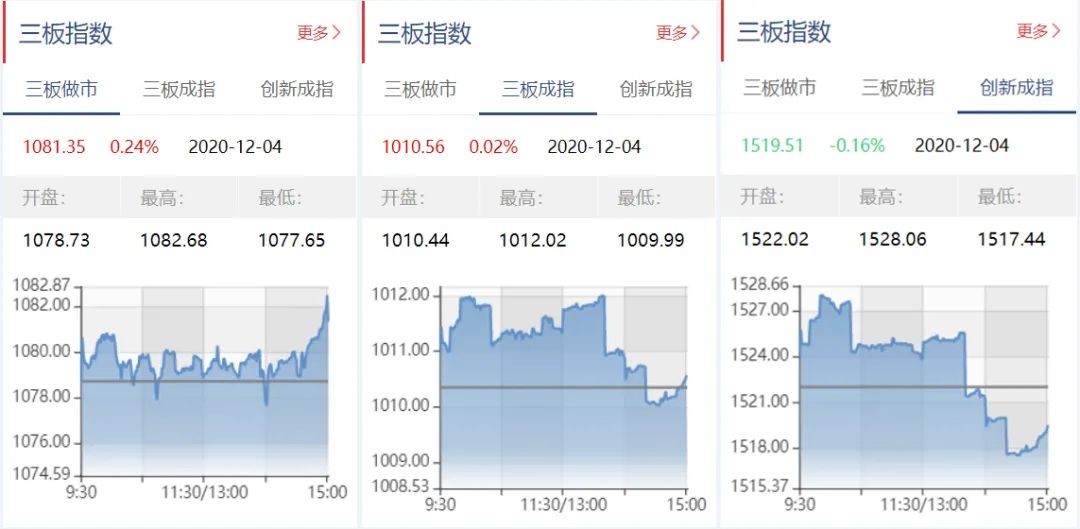 截至12月4日收盘,三板做市报1081.35点,上涨0.24%;三板成指报1010.56点,上涨0.02%;三板创新成指报1519.51点,下降0.16%。