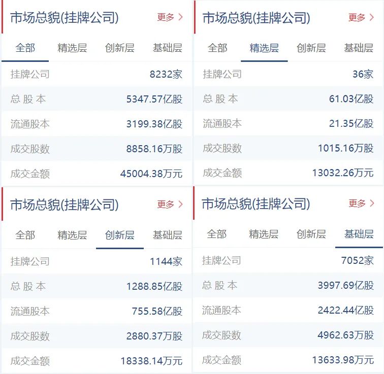新三板挂牌公司总计8232家(精选层36家,创新层1144家,基础层7052家),总股本5347.57亿股,流通股本3199.38亿股。