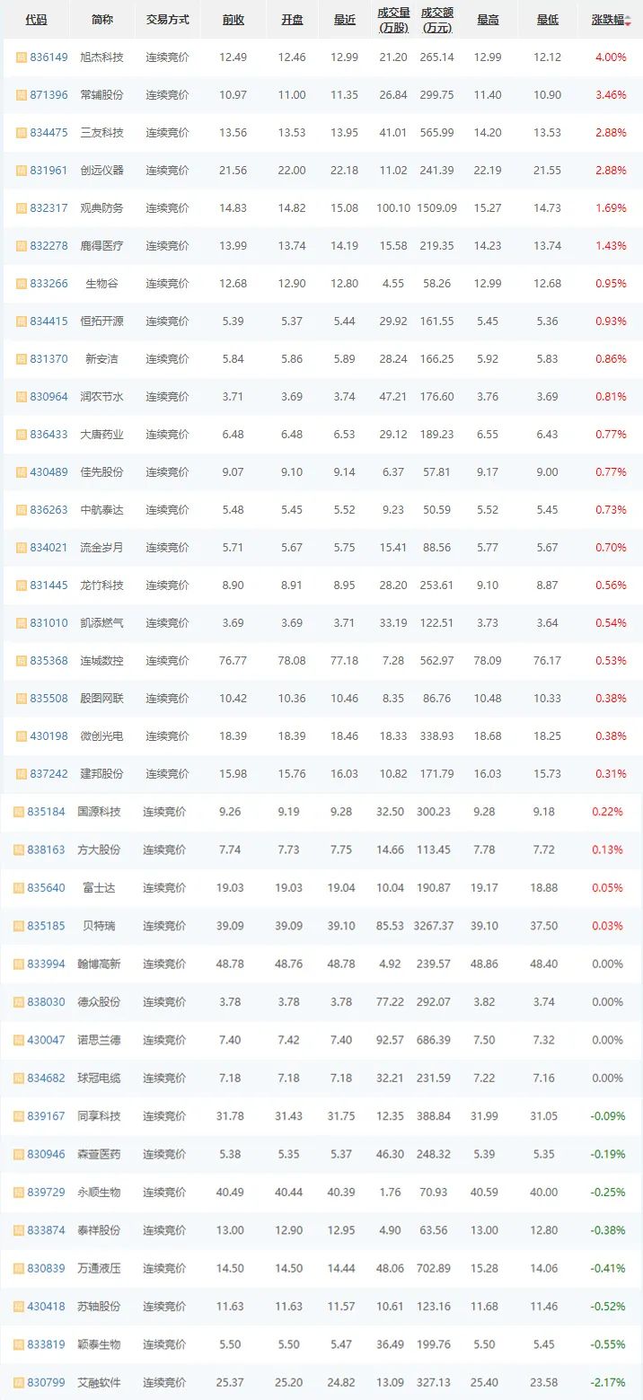 12月4日,精选层普跌,36家企业24家涨,4家平盘,8家跌;其中,旭杰科技(836149)涨幅居首,上涨4.00%;其次,常辅股份(871396)上涨3.46%;艾融科技(830799)跌幅居首,下跌2.17%;颖泰生物(833819)居次,下跌0.55%;翰博高新(833994)、德众股份(838030)等平盘。