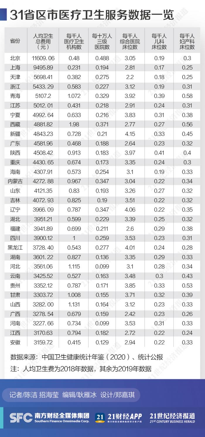21世纪经济研究院通过对医院数量、卫生人员数、医疗卫生床位数、卫生费用和妇幼医疗资源等维度的数据对比,对各地医疗资源进行盘点。