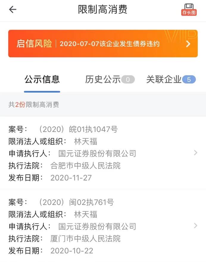 该限制消费令称,“本院于2020年8月11日立案执行申请人国元证券股份有限公司申请执行你单位证券纠纷一案,因你单位未按执行通知书指定的期间履行生效法律文书确定的给付义务,对你单位采取限制消费措施,限制你单位及你单位法定代表人林天福不得实施以下高消费及非生活和工作必需的消费行为。”