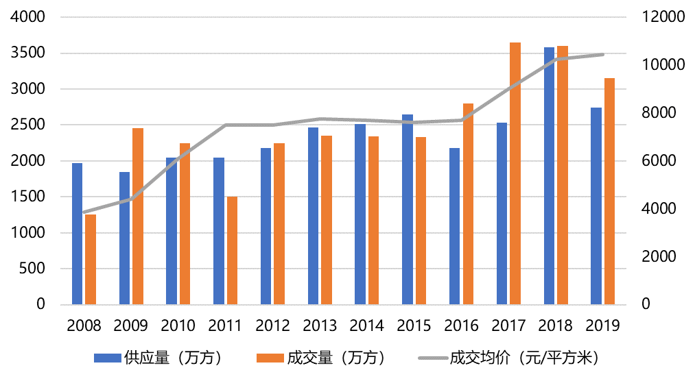 图6:2008-2019重庆主城商品房供应成交量价走势