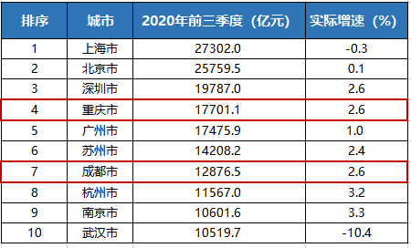 在2020年前三季度GDP前十城市中,重庆和成都分别取得第四和第七的榜单排名。值得注意的是,重庆挑战了传统的“北上广深”位于榜单前四位的常态,成功取代了广州市,位居榜单第四位,广州下滑到第五位。