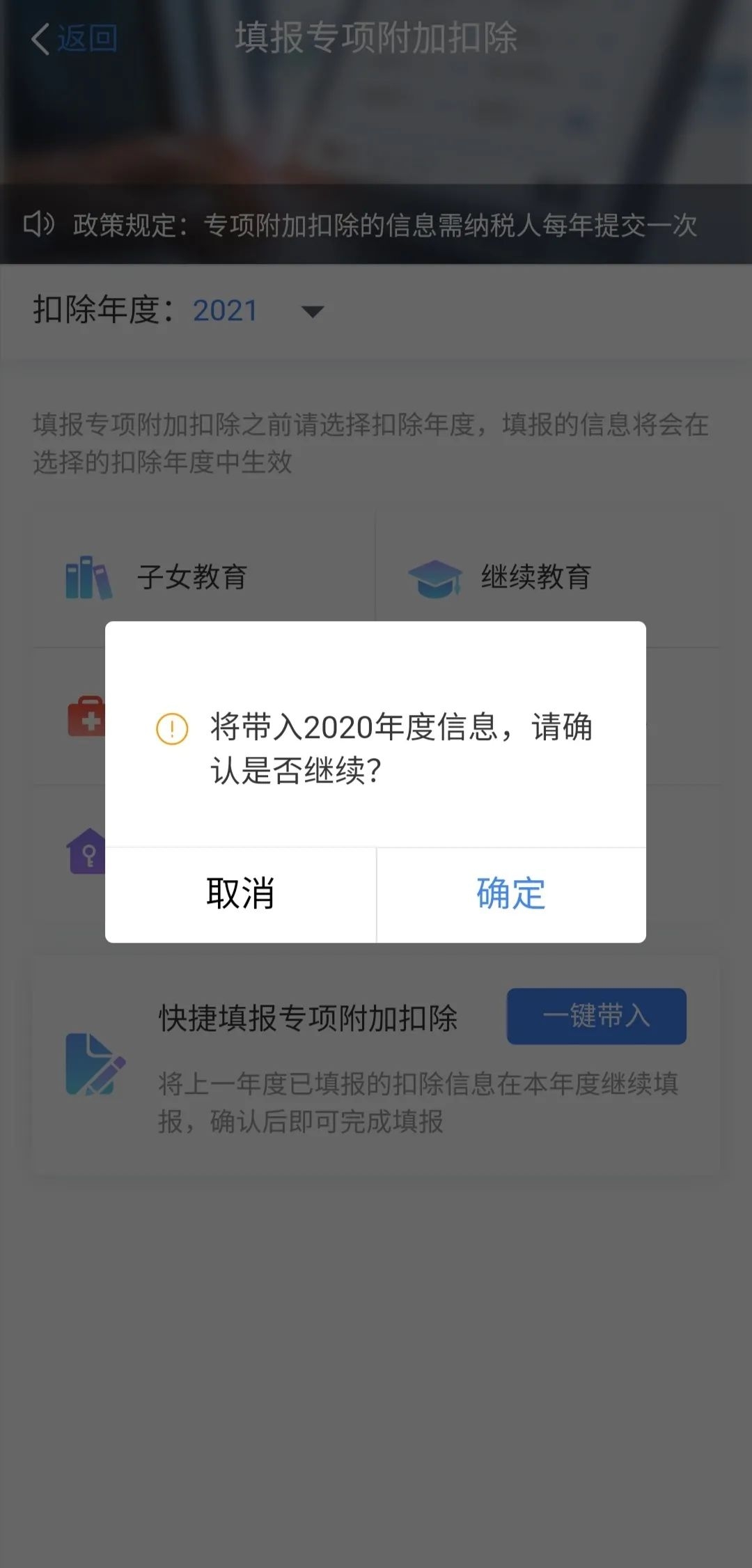 根据操作指引,填报专项附加扣除信息可以快捷操作:选择扣除年度2021年,一键带入,如有变动,还可以点击修改,然后一键确认完成该项操作。