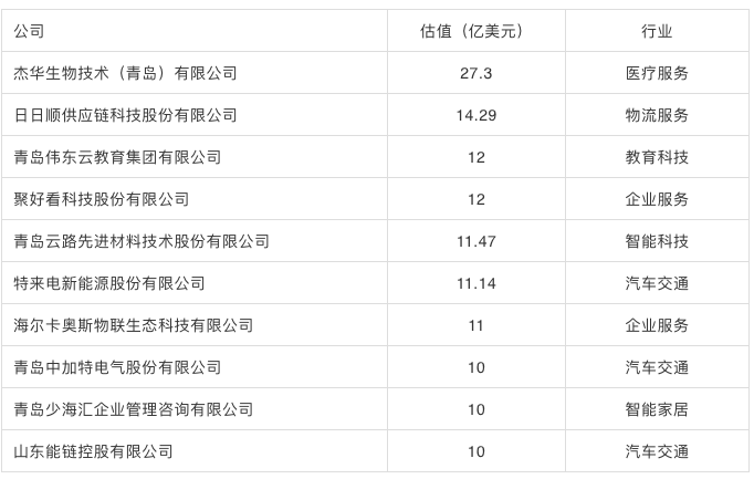 综合来看,这十家独角兽企业总估值达197.87亿美元,均属于前沿科技领域,涉及工业互联网、智慧物流、生物医药、互联网教育、新文娱行业、企业服务、汽车交通等多个领域。象征着岛城产业转型与技术发展的蓬勃力量。
