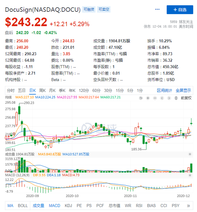 财报发布后,不同于近日股价走跌的同行们,Docusign获得了较好的市场情绪反应,股价涨超5%。截至美股研究社发稿,Docusign每股报243.22美元,总市值为450.36亿美元。