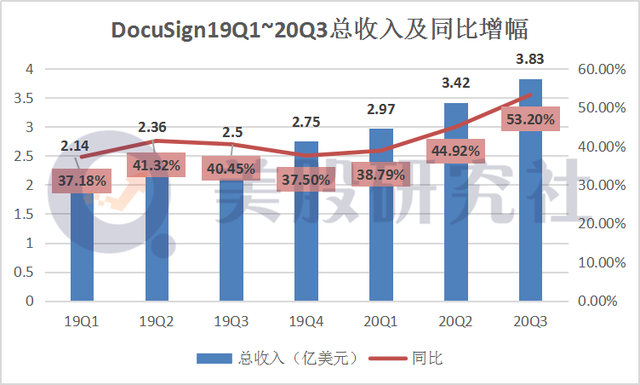 今年以来受疫情影响,全球办公云化速度加快,第三季度Docusign的电子签名业务增长依旧较为强劲,总营收为3.829亿美元,超出市场预期的3.618亿美元将近6%。