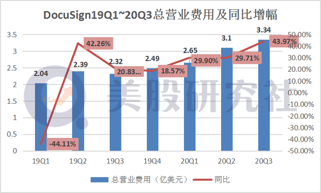 第三季度Docusign的总营业费用为3.34亿美元,同比增长了43.97%,其中研发支出为0.73亿美元,同比增长49%;营销费用为2.1亿美元,同比增长41%。