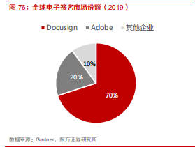 根据东方证券研究所整理的数据显示,目前在全球电子签名市场,DocuSign 处于绝对龙头地位,占据 70%左右的市场份额,其次是Adobe仅占20%的市场份额,只有剩余约10%的市场份额被其他中小公司瓜分。