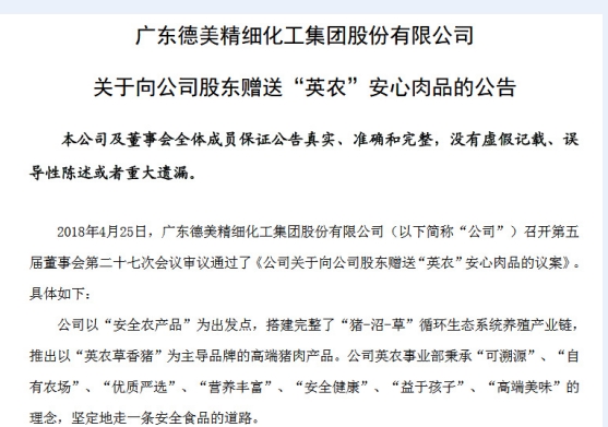 而亏损主要原因是跨界布局农业所致。2011年,德美化工开始投入农牧业,并推出了以“英农草香猪”为主导品牌的高端猪肉产品。而公司连续多年送股民猪肉还一度上了新闻热搜。