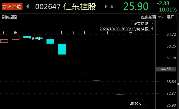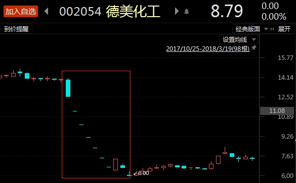 而德美化工的当时闪电连崩,和近期的仁东控股非常相似。该股从11月20日创下的新高至今,它已经连收8个跌停,股价下跌近60%。其中连续7个一字跌停,让场内大量资金没有一丝出逃的机会。
