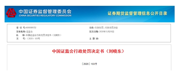 证监会网站同日更新的市场禁入决定书显示,证监会决定对刘晓东采取终身证券市场禁入措施。