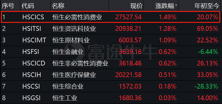 Wind数据显示,截至收盘,港股必需性消费品板块以1.49%的涨幅居于多个板块之首,该板块年初至今涨幅已超过20%。