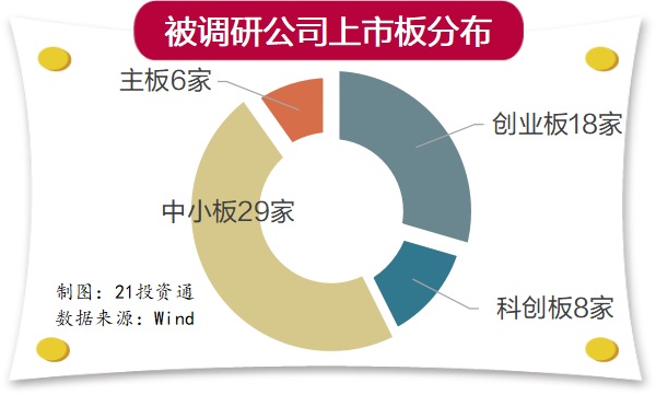 据21投资通统计显示,被机构调研的这61家公司中,主板企业仅6家,中小板企业占比近半。