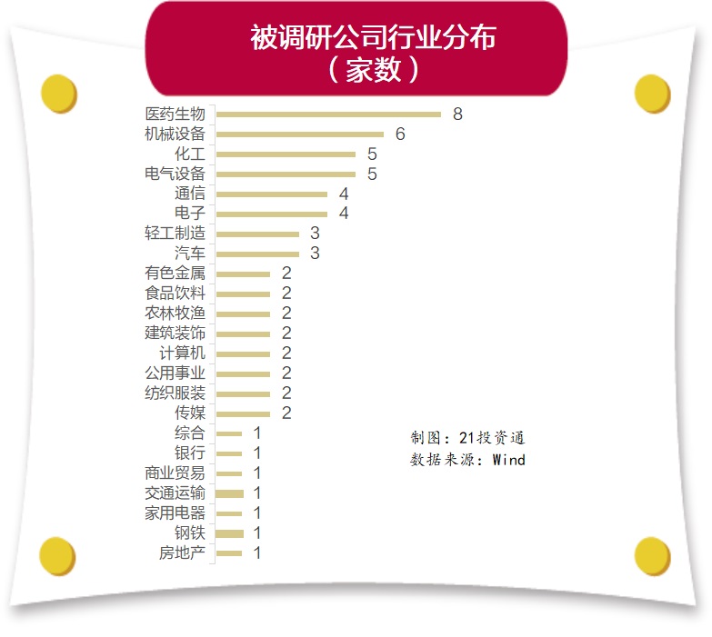 从行业分布来看,医药生物最受关注,8家公司获机构调研,其次为机械设备,化工和电气设备则均有5家公司受到青睐。
