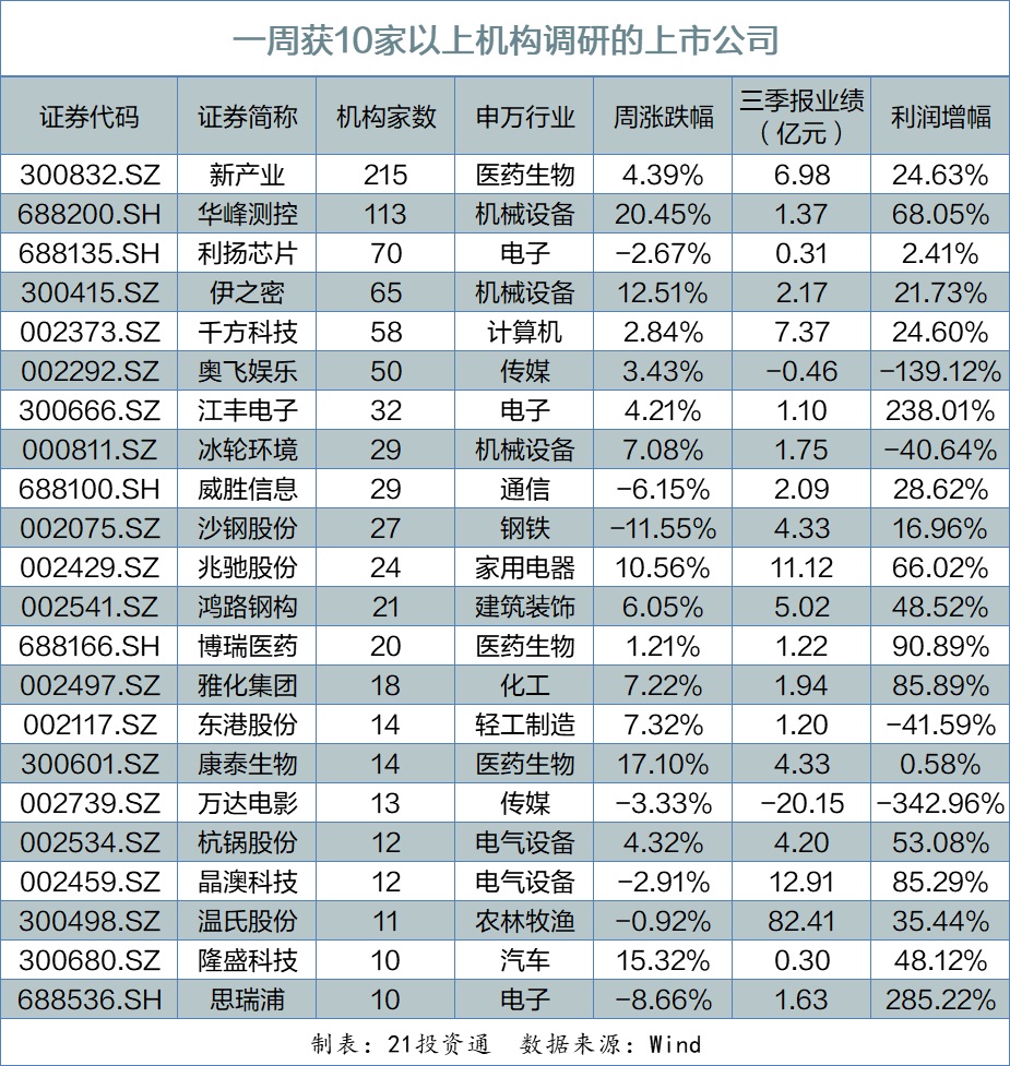 从公司来看,两家公司获得逾百家机构调研,其中最受关注的公司为新产业(300832.SZ),这家上市不足7个月的公司共获得215家公司扎堆关注。这是一家主营系列全自动化学发光免疫分析仪器及配套试剂的公司,众多机构关注的是近期颁布的集中采购政策是否对身在医药生物行业的新产业产生影响,对此,新产业回复称,本轮集采主要针对高值耗材,体外诊断试剂暂未被纳入国家集采范围,因此公司业务暂未受到影响。