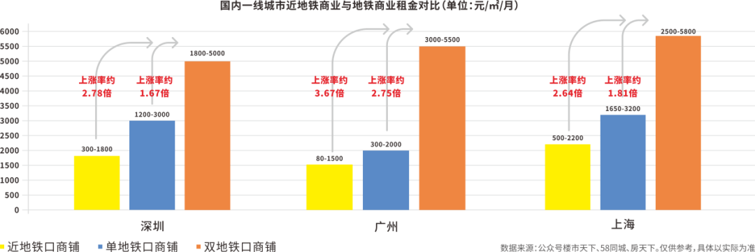 同时,一组专业研究数据显示,客流较大的双地跌口的商铺回报率及资金价格最高,以一线城市深圳为例,双地跌口商铺价格在1800/㎡—5000/㎡一月,而单地铁口商铺则是1200/平方—3000/平方,根据商铺与地铁间紧密度,商铺租金费用依次递减。
