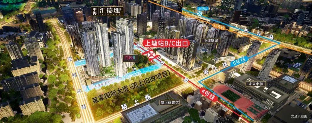 其次,百悦汇项目是“双地铁口”商铺,处于龙华上塘地铁站,接驶B、C双出口,日均客流量巨大,不仅承接福田、深圳北双总部基地精英客群,随着规划中的33号线、深惠城际开通后,亦将连接宝安机场,贯穿龙华中心区、北站商务基地,串联深圳、惠州,四线汇聚带来湾区庞大客流。