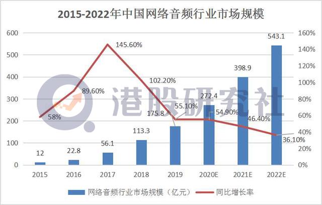 在国内市场,据艾瑞咨询发布的《2020年中国网络音频行业研究报告》显示,2019年中国网络音频用户规模达4.9亿,行业市场规模同比上年增长55.1%至175.8亿元,预计2022年中国网络音频行业市场规模将达到543.1亿元。