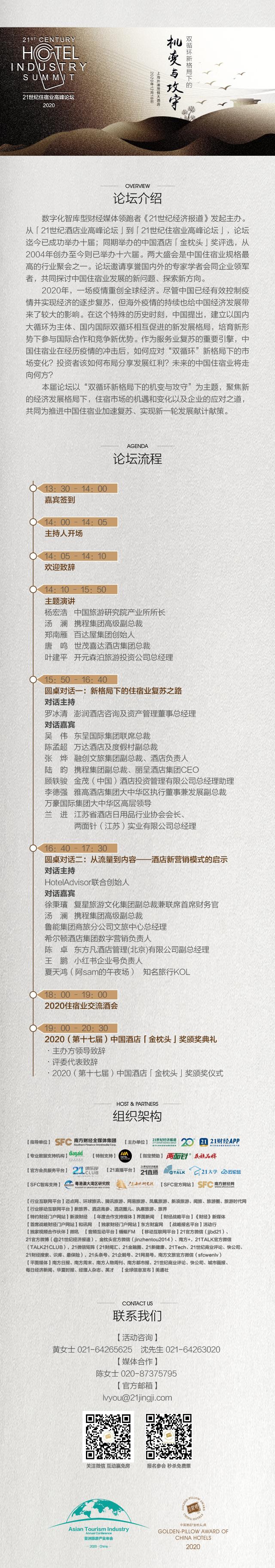 由21世纪经济报道主办的21世纪住宿业高峰论坛(2020),12月18日将在上海外滩茂悦大酒店盛大开幕,主题是“双循环新格局下的机变与攻守”。2020(第十七届)中国酒店「金枕头」奖也将于当晚揭晓。