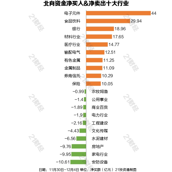 行业方面,北向资金净买入电子元件最多,净买入金额达44.00亿元,净卖出安防设备最多,净卖出金额达10.61亿元。
