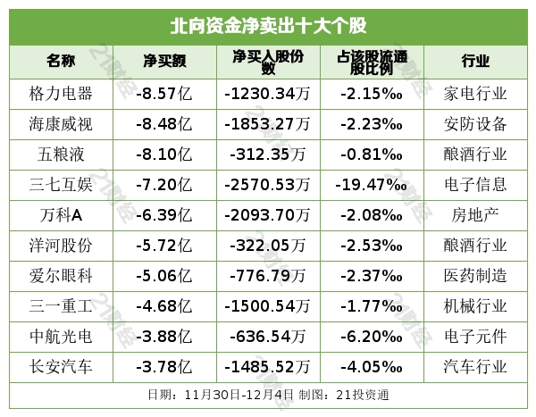 北向资金净卖出格力电器(000651.SZ)、海康威视(002415.SZ)、五粮液(000858.SZ)居前,其中,格力电器被净卖出8.57亿元,海康威视被净卖出8.48亿元,五粮液被净卖出8.10亿元。