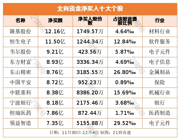 个股方面,北向资金净买入隆基股份(601012.SH)、恒生电子(600570.SH)、韦尔股份(603501.SH)居前,其中,隆基股份被净买入12.16亿元,恒生电子被净买入11.50亿元,韦尔股份被净买入9.21亿元。